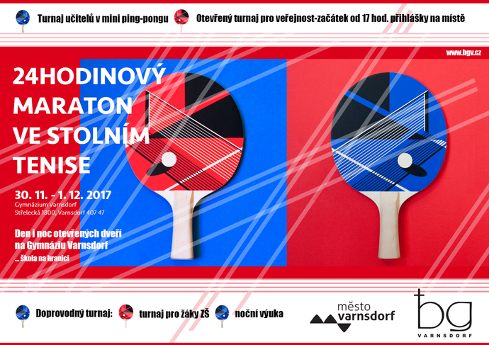 Škola hrou, řekl učitel národů Jan Amos Komenský. Hesla se drží Gymnázium Varnsdorf, které pořádá den i noc otevřených dveří ze čtvrtka 30. listopadu na 1. prosince. V rámci otevřených dveří si připravili další ročník 24 hodinového maratonu ve stolním tenisu. Více informací v přiloženém plakátu.