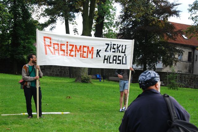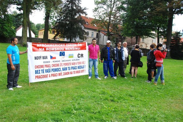 Pozornost novinářů vzbudila také skupinka romských obyvatel, kteří k zámku dorazili s transparentem požadujícím pomoc a pracovní příležitosti.