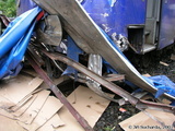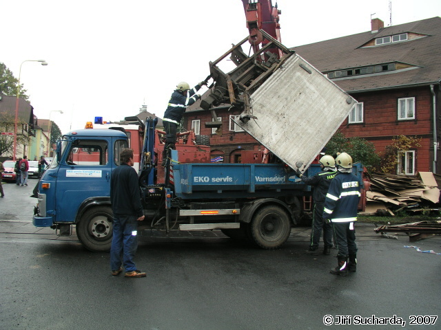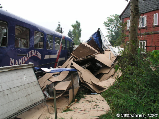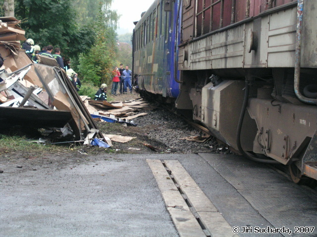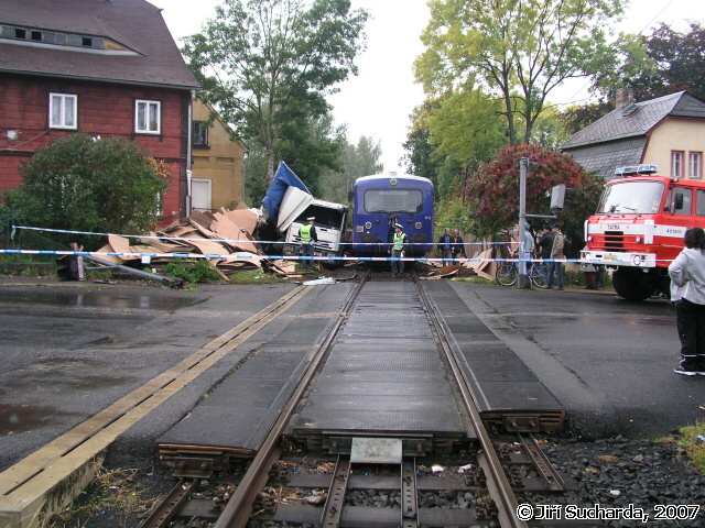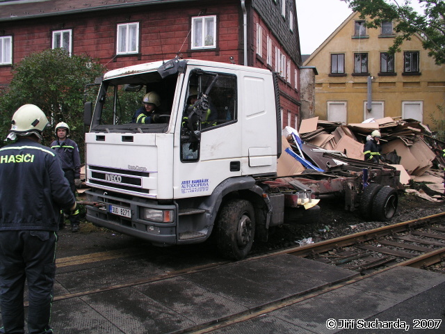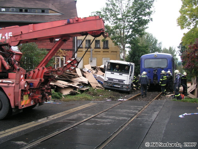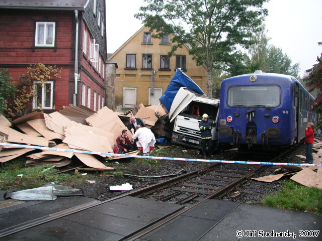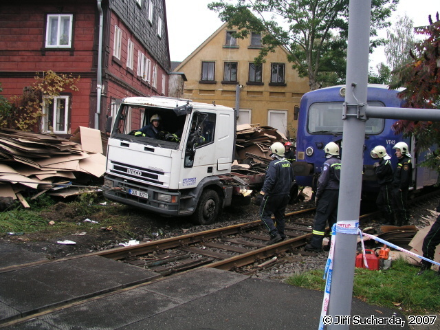 V 9:52 hod. byla oznámena prostřednictvím všech tísňových linek dopravní nehoda nákladního vozidla s vlakem se zraněním na železničním přejezdu v ulici Pražská známým jako přejezd pod Mělníkem (podle stejnojmenné restaurace). Na místo vyjížděly jednotky HZS Varnsdorf, JSDH Varnsdorf a Rumburk. Vzhledem k situaci na místě nehody byla jednotka Varnsdorf ponechána na základně jako záloha, jednotka Rumburk byla po dojezdu na místo vrácena zpět na základnu. Na místě nehody se nacházel jednomotorový vůz společnosti SBE/Railtrans německého dopravce a nákladní vozidlo Iveco místního přepravce. Řidič nákladního vozidla byl při nehodě nezraněn a seděl mimo vozidlo, strojvůdce vlaku byl ošetřován praktickou lékařkou, která má vedle přejezdu ordinaci. Jednalo se o tržné krvácející poranění hlavy, po dojezdu vozidla RZS byl pacient převezen do nemocnice v Rumburku. Na obou vozidlech byly mezitím provedeny protipožární opatření a byl zastaven drobný únik pohonných hmot z filtru motorového vlaku. Po zajištění a ohraničení místa nehody se na místo dostavili hasiči z HZSP ČD z Děčína, Ústí nad Labem a Liberce s technickými prostředky (nakolejovací bačkory), dalšími vozidly a vyprošťovacím vozidlem Tatra. Po vyšetření nehody pracovníky drážní inspekce bylo započato s vyprošťováním nákladního automobilu, kterému předcházelo rozřezání nástavby a odstranění zbytků plotu sousedního podstávkového domu, který byl mj. při nehodě také drobně poškozen (okap, fasáda). Po odstranění nákladního vozidla byly na místo přistaveny kontejnery na odvoz nákladu, mezitím hasiči ČD připravovali nakolejení drážního vozidla. Po příjezdu odtahové lokomotivy bylo na druhý pokus provedeno nakolejení vozidla a po prohlídce podvozku jeho odtažení na hlavní nádraží do Varnsdorfu. Nákladní vozidlo bylo odtaženo traktorem hasičů Varnsdorf k dopravci, během středečního dne byl dopravcem odvezen náklad a zároveň byl do restaurátorské dílny odvezen kříž i s pískovcovým podstavcem.