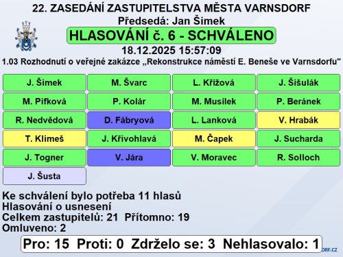 Zastupitelstvo města rozhodlo přidělit veřejnou zakázku: „Rekonstrukce náměstí E. Beneše ve Varnsdorfu“ společnosti Metrostav CZ s.r.o., se sídlem Koželužská 2450/4, 180 00 Praha 8 – Libeň s.r.o., IČO 25021915.