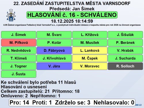 Zastupitelstvo města rozhodlo schválit poskytnutí individuální dotace ve výši 1.500.000 Kč spolku FK Varnsdorf z.s., Moravská 2688, 407 47 Varnsdorf, IČO 64707369, na činnost spolku za podmínek dle předloženého návrhu.