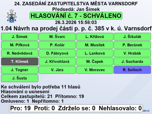 Zastupitelstvo města rozhodlo prodat část p. p. č. 385 – ostatní plocha, ostatní komunikace o výměře 100 m2 v k. ú. Varnsdorf (dle geometrického plánu č. 8058-1825/2025 část označena jako 385/2) panu M. J. a paní M. J., a to tak, že každému ½ za kupní cenu 30.000 Kč, splatnou do 15 dnů od podpisu kupní smlouvy. Náklady spojené s převodem nemovitosti uhradí kupující.