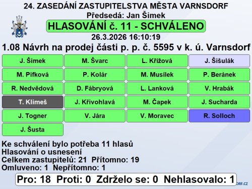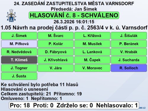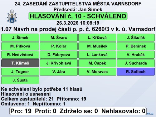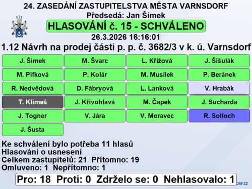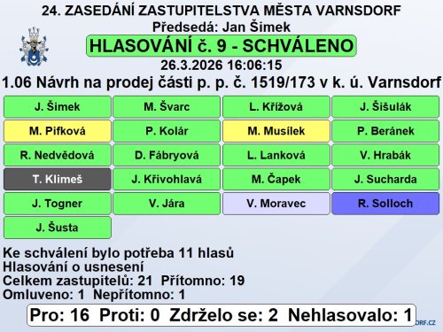 Zastupitelstvo města rozhodlo prodat část p. p. č. 2563/4 – zahradu o výměře 31 m2 a část p. p. č. 2563/4 – zahradu o výměře 6 m2 v k. ú. Varnsdorf (dle geometrického plánu č. 8064-178/2026 části označeny jako 2563/12 a 2563/13) manželům Z. a S. M., manželům F. a J. H. a panu K. F. a to tak, že každému 1/3 za kupní cenu 11.100 Kč, splatnou do 15 dnů od podpisu kupní smlouvy. Náklady spojené s převodem nemovitosti uhradí kupující.