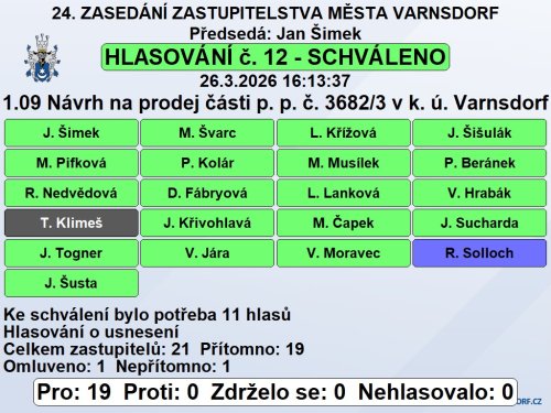 Zastupitelstvo města rozhodlo prodat část p. p. č. 6770/1 – trvalý travní porost o výměře 19 m2 v k. ú. Varnsdorf (dle geometrického plánu č. 7914-35216/2025 část označena jako 6770/4) společnosti ČEZ Distribuce a.s., IČO 24729035, se sídlem Děčín IV-Podmokly, Teplická 874/8 za kupní cenu 3.800 Kč, splatnou do 15 dnů od podpisu kupní smlouvy. Náklady spojené s převodem nemovitosti uhradí kupující.