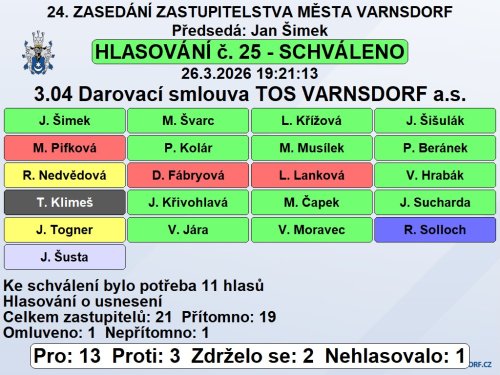Zastupitelstvo města rozhodlo schválit uzavření darovací smlouvy mezi městem Varnsdorf a společností TOS VARNSDORF a.s., se sídlem Říční 1774, 407 47 Varnsdorf, IČO 27327850, jejímž předmětem je poskytnutí peněžního daru ve výši 3.000.000 Kč na úhradu nákladů spojených s provozem Mateřské školy Varnsdorf, Nezvalova 2024, příspěvková organizace na ulici Západní 3624 ve Varnsdorfu, a to dle předloženého návrhu smlouvy.