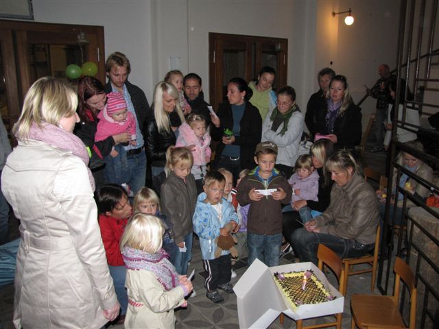 Ve čtvrtek 4. října jsme se sešli znovu a byl to zase příjemný zážitek. Netradiční oslava se konala v prostorách starokatolického kostela. Bezprostřednost dětí, příběh o Jonášovi a velrybě v podání R. Sollocha, Kuby, Maxe a Rolíka, veliký dort a další dobroty, maminky a tatínkové, paní učitelky a páni učitelé z gymnázia, náš sbor a další gratulanti, to všechno dohromady udělalo z prvních Jonášových narozenin něco neopakovatelného. Přejeme další a další oslavy, a hlavně další spokojené maminky a děti!