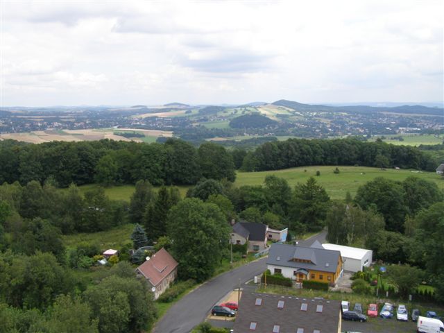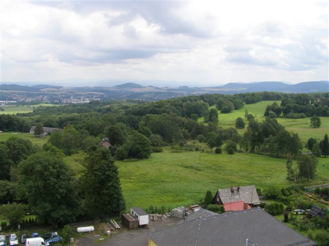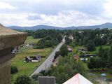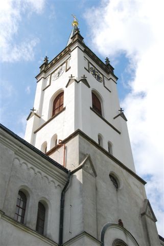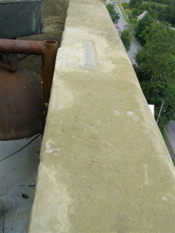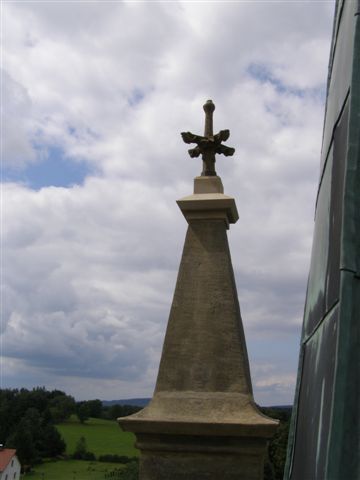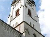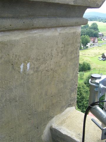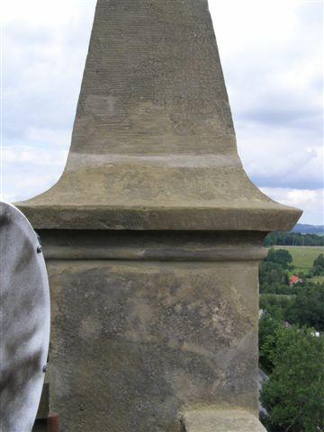 Na fotografiích: účastníci předání opravy, detaily opravených kamenných prvků na ochozu věže, výhled z věže.