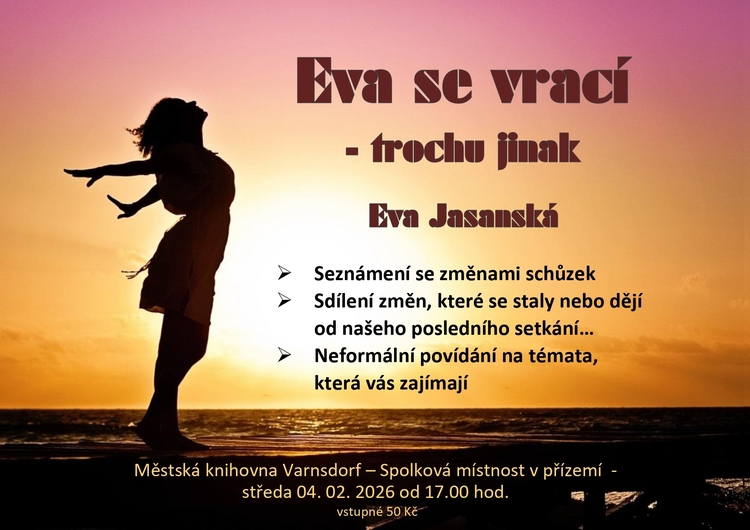 Eva Jasanská se vrací do varnsdorfské knihovny s neformálním povídáním o novinkách a sdílením životních příběhů v přátelském kruhu. Přijďte se seznámit se změnami v setkávání a prodiskutovat témata, která vás zajímají, v příjemném prostředí spolkové místnosti.