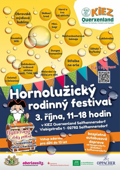 Hornolužický rodinný festival v KIEZ Querxenland v nedalekém Seifhennersdorfu nabízí den plný zábavy pro celou rodinu. Těšit se můžete na obrovské mýdlové bubliny, skákací hrad, mini-bagr, kouzelníka Williho, lukostřelbu, dětské čtyřkolky a také na Loupežnickou rallye s Karáskem, kde se hledá zlatý poklad. Vstup je zdarma pro děti do 13 let a zajištěna je i bezplatná autobusová doprava z Varnsdorfu (Eiskeller) do Seifhennersdorfu a zpět.
