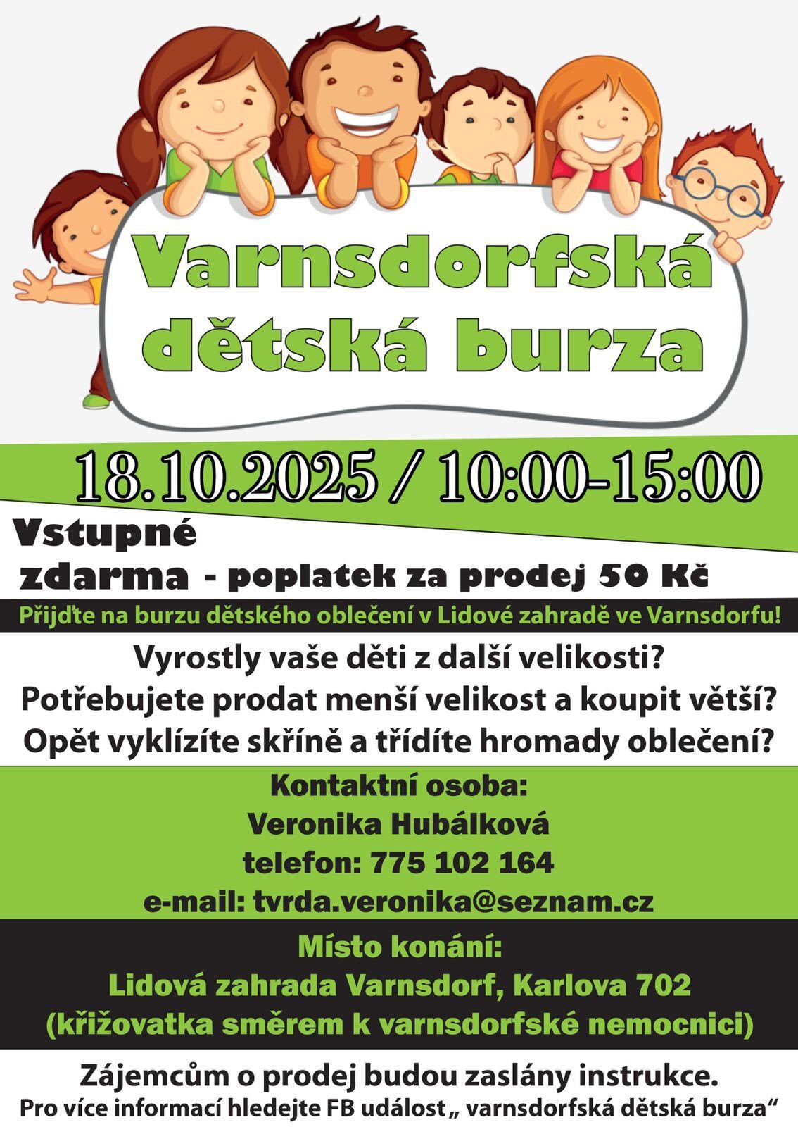 Home > Volný čas > Kalendář akcí > Detail akce Varnsdorfská dětská burza 18. 10. 2025 10:00 – 15:00 Vyrostly vaše děti s další velikosti? Přijďte jim doplnit šatník na Lidovou zahradu. Ostatní Zpět Další informace a akce