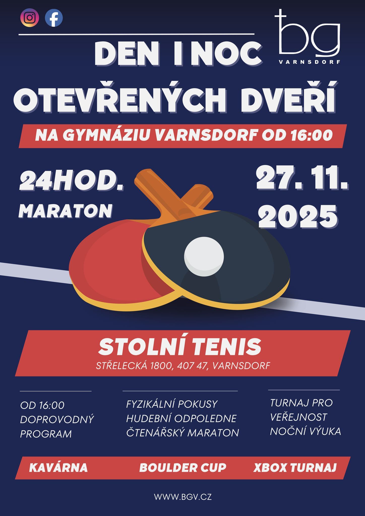 Od 16:00 startuje akce, kde se nepotkáte jen s učiteli, ale hlavně se stolem na ping-pong. Stolní tenis je evidentně náboženství, které na gymnáziu vyznávají. K tomu přidejte Kavárnu (budete ji potřebovat!), noční výuku, fyzikální pokusy a drsný Boulder Cup.