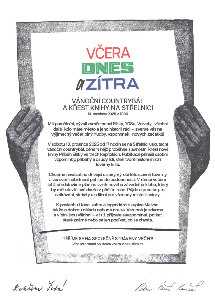 Pamětníci, bývalí zaměstnanci Elitky, TOSu, Velvety, a nejen ti, jsou zváni na výjimečný večer plný hudby, vzpomínek a nových zážitků na Střelnici. Zahraje Malvas a vstupné je zdarma!