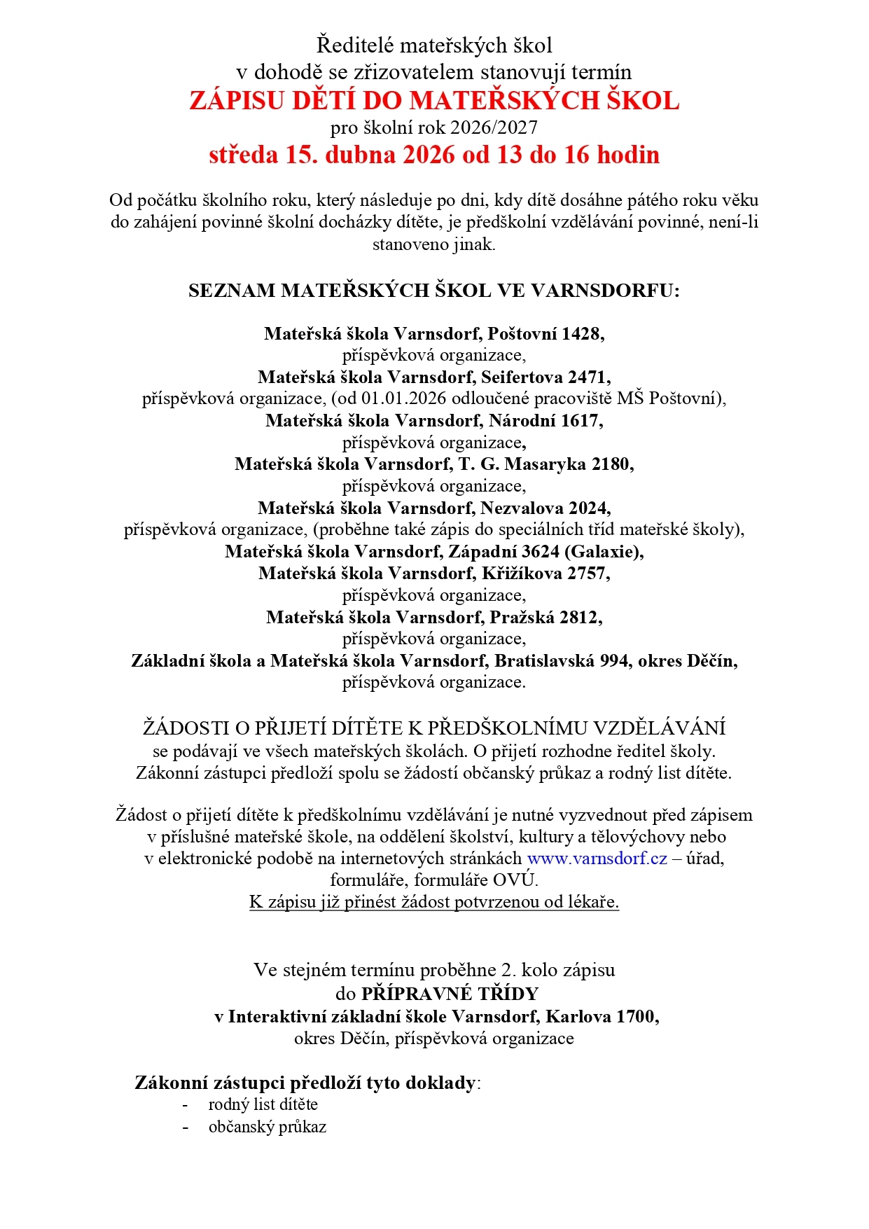 V dubnu proběhnou ve Varnsdorfu zápisy do mateřských škol a druhé kolo zápisů do přípravné třídy základní školy. Pro zájemce o základní vzdělávání je v únoru připraven zápis do prvních tříd a první kolo zápisu do třídy přípravné.