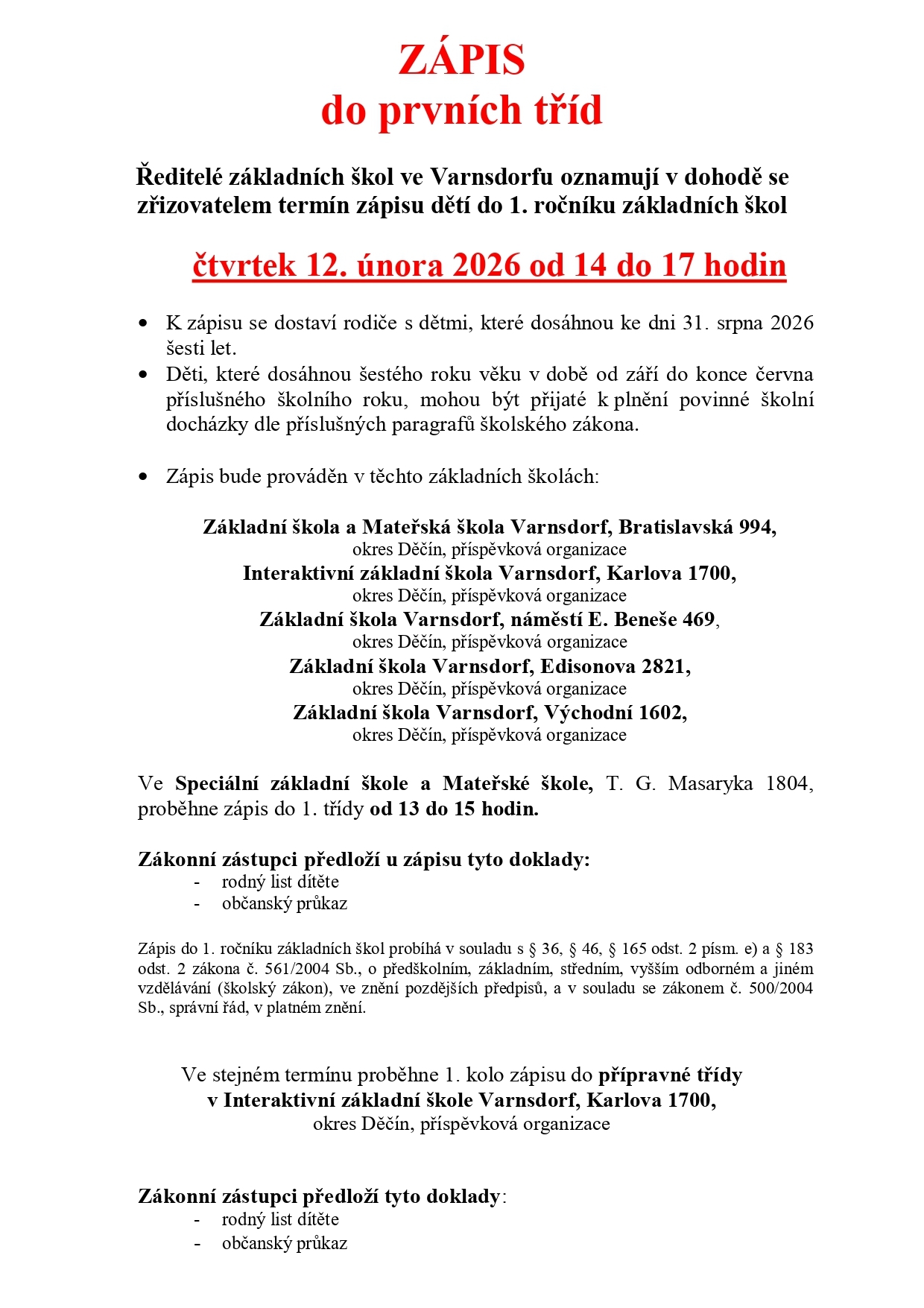 Varnsdorfské základní školy zvou budoucí prvňáčky a jejich rodiče k zápisům do prvních tříd a přípravné třídy. K zápisu je nutné přinést rodný list dítěte a občanský průkaz zákonného zástupce.