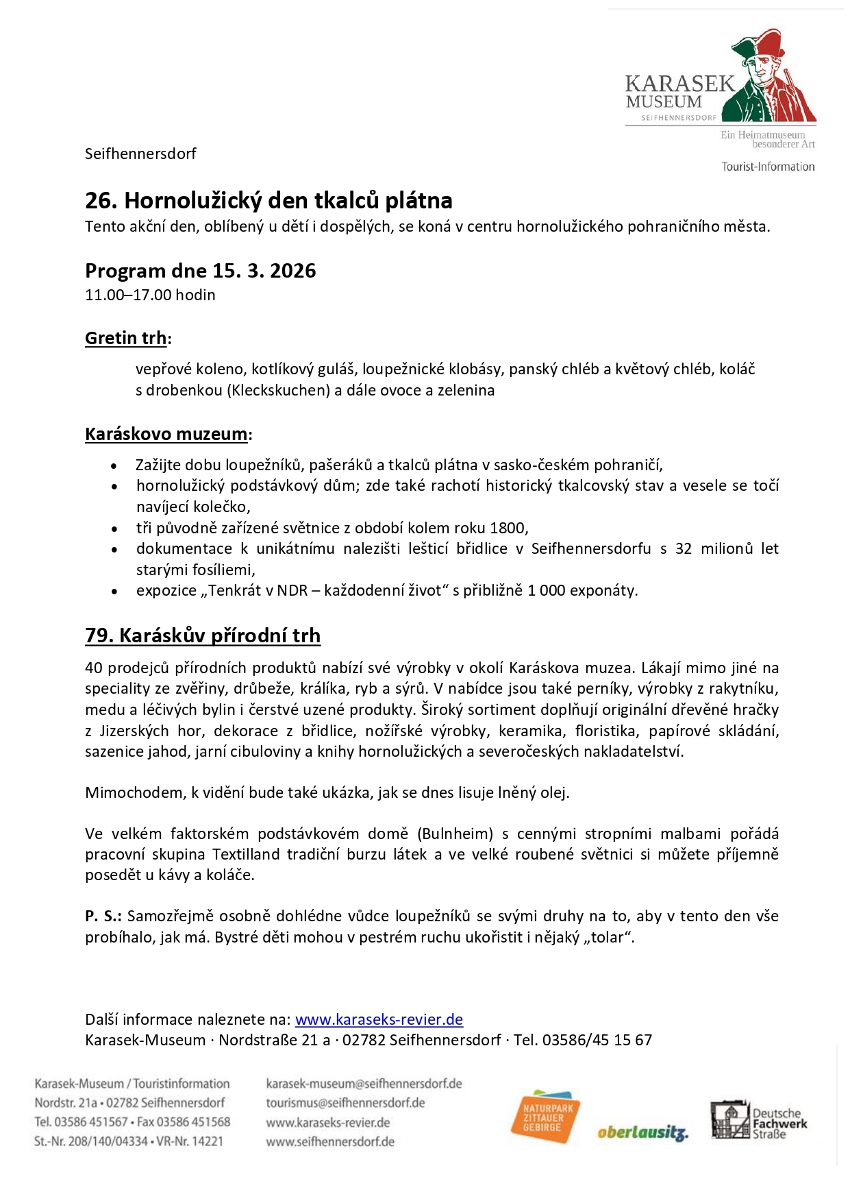 Seifhennersdorf ožije tradičním Hornolužickým dnem tkalců plátna, který v centru Karáskova revíru nabídne bohatý program pro děti i dospělé. Těšit se můžete na velký přírodní trh se 40 prodejci, ukázky lisování lněného oleje i návštěvu muzea s expozicí o životě loupežníků a pašeráků. Atmosféru jarmarku doplní stylové občerstvení v podobě panského chleba či loupežnických klobás pod dohledem samotného vůdce loupežníků.