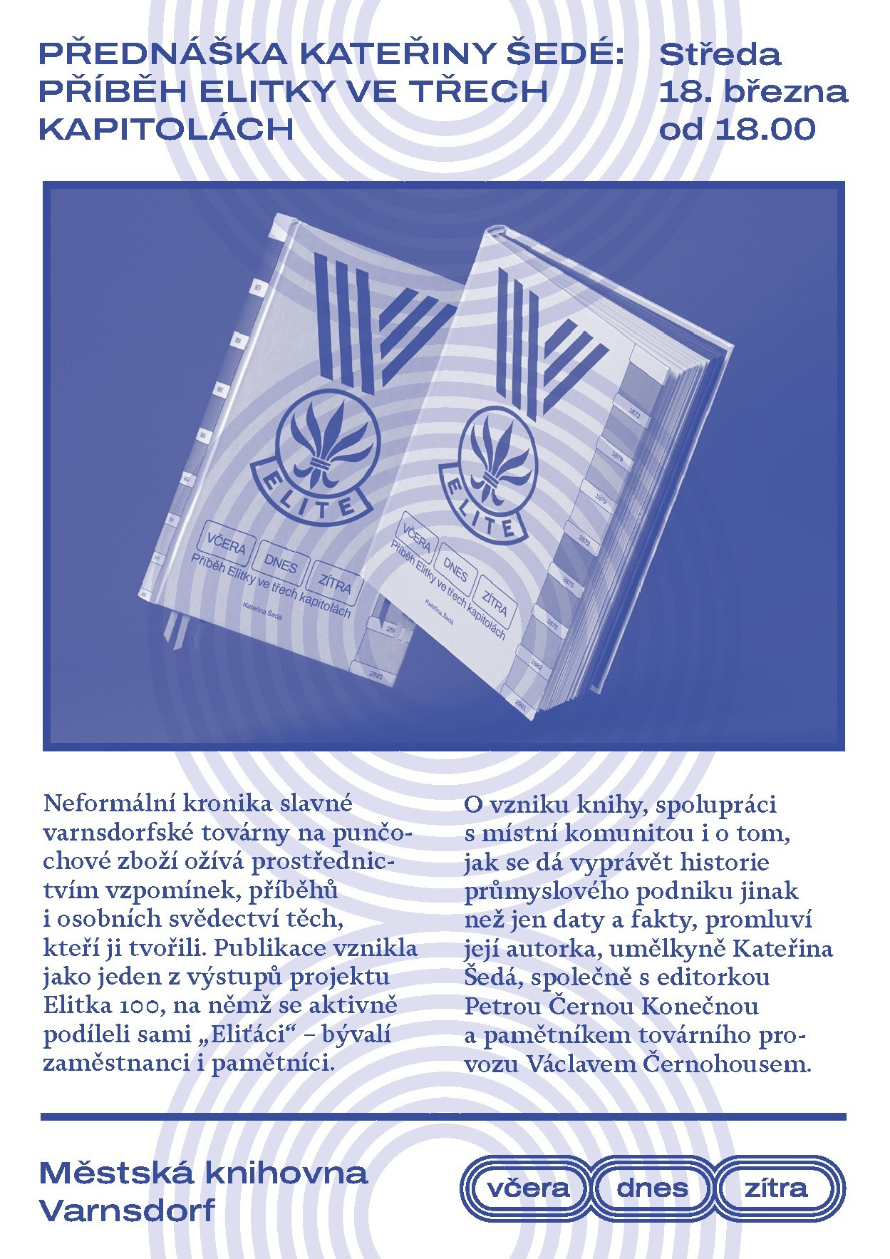 Městská knihovna Varnsdorf zve na přednášku Kateřiny Šedé s názvem Příběh Elitky ve třech kapitolách, která představuje neformální kroniku slavné místní továrny na punčochové zboží. Autorka společně s hosty přiblíží vznik publikace oživené vzpomínkami a osobními svědectvími bývalých zaměstnanců, která nabízí netradiční pohled na historii tohoto průmyslového podniku.