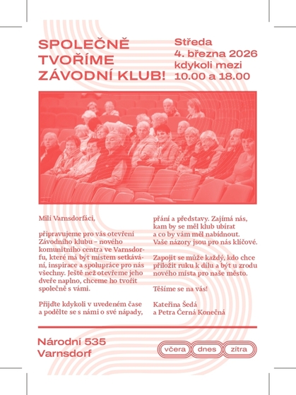 Přijďte se podělit o své nápady a přání ohledně nového komunitního centra ve Varnsdorfu na adrese Národní 535. Hledáme inspiraci pro budoucí směřování klubu, aby se stal místem setkávání a spolupráce pro nás všechny. Kateřina Šedá a Petra Černá Konečná