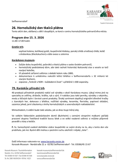 Seifhennersdorf ožije tradičním Hornolužickým dnem tkalců plátna, který v centru Karáskova revíru nabídne bohatý program pro děti i dospělé. Těšit se můžete na velký přírodní trh se 40 prodejci, ukázky lisování lněného oleje i návštěvu muzea s expozicí o životě loupežníků a pašeráků. Atmosféru jarmarku doplní stylové občerstvení v podobě panského chleba či loupežnických klobás pod dohledem samotného vůdce loupežníků.