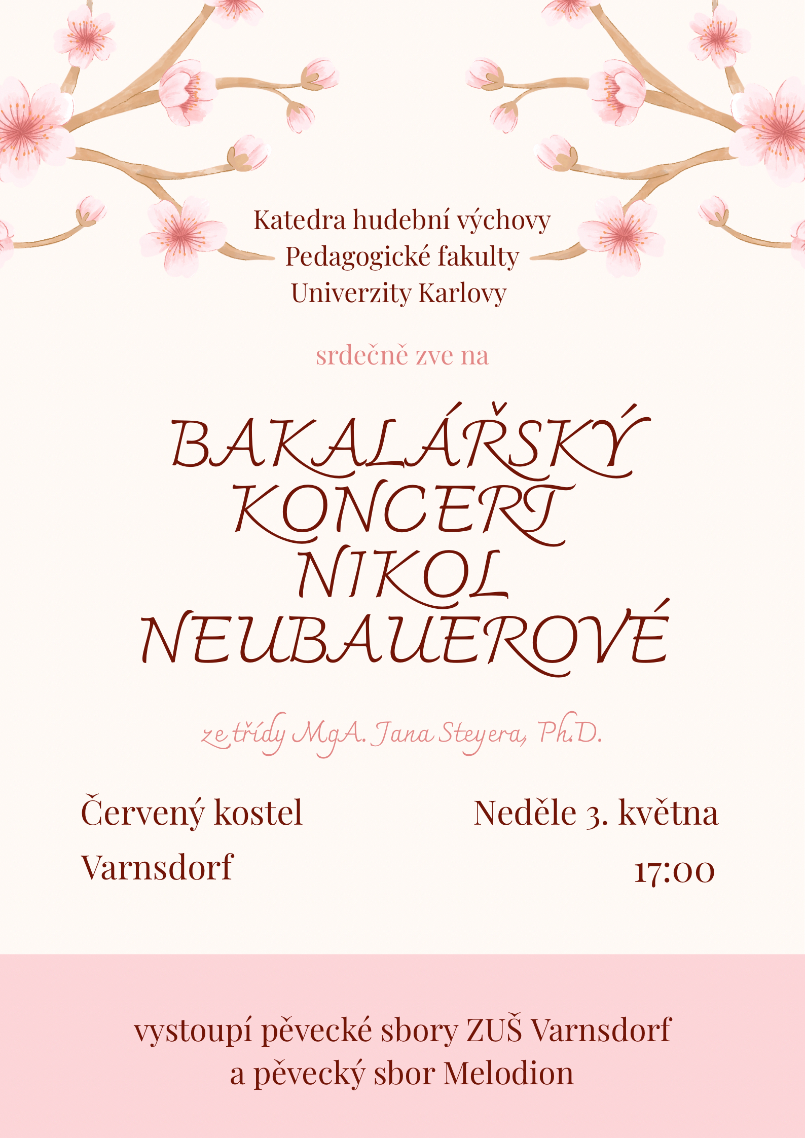 Home > Volný čas > Kalendář akcí > Kalendář událostí Kalendář událostí Bakalářský koncert Nikol Neubauerové 3. 5. 2026 17:00 - 19:00 Katedra hudební výchovy Pedagogické fakulty Univerzity Karlovy vás srdečně zve do Červeného kostela na bakalářský koncert Nikol Neubauerové, kde vystoupí pěvecké sbory ZUŠ Varnsdorf a pěvecký sbor Melodion. Zpět
