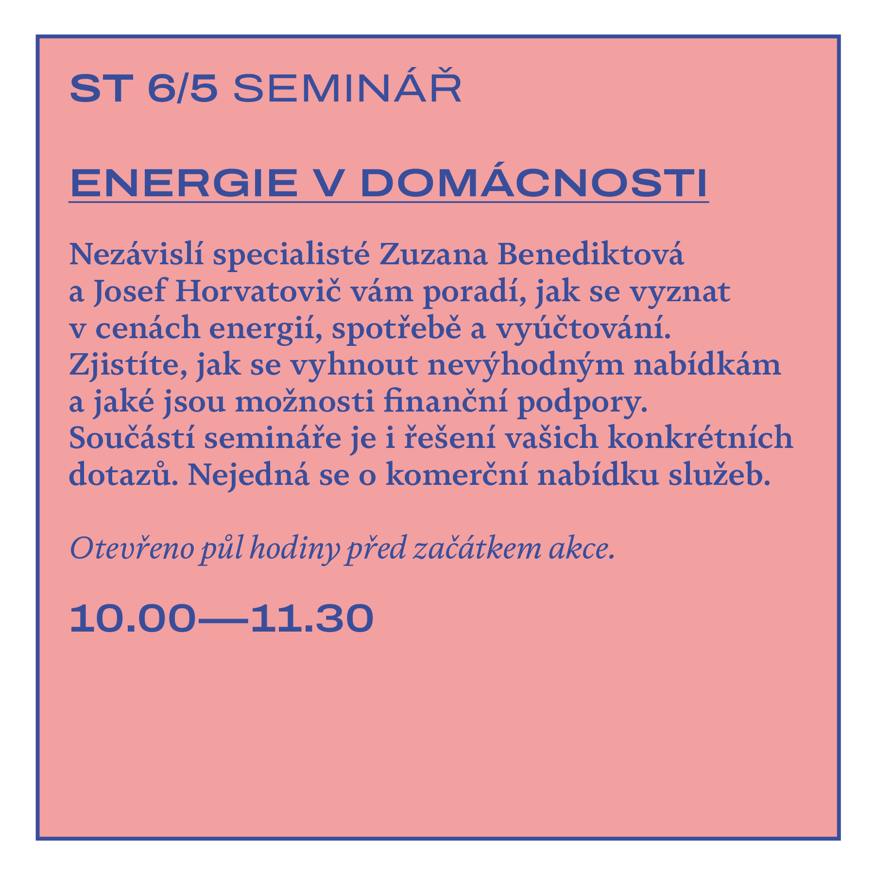 Nezávislí specialisté Zuzana Benediktová a Josef Horvatovič vám poradí, jak se vyznat v cenách energií, spotřebě a vyúčtování. Zjistíte, jak se vyhnout nevýhodným nabídkám a jaké jsou možnosti finanční podpory. Součástí semináře je i řešení vašich konkrétních dotazů. Nejedná se o komerční nabídku služeb. Otevřeno půl hodiny před začátkem akce.