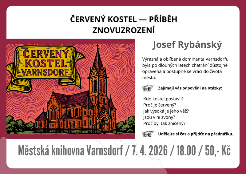 Přijďte si do městské knihovny poslechnout fascinující příběh o znovuzrození Červeného kostela, výrazné dominanty našeho města. Přednáška Josefa Rybánského vám odhalí tajemství jeho stavby, pohnutou historii i detaily o nedávné rekonstrukci této unikátní památky.
