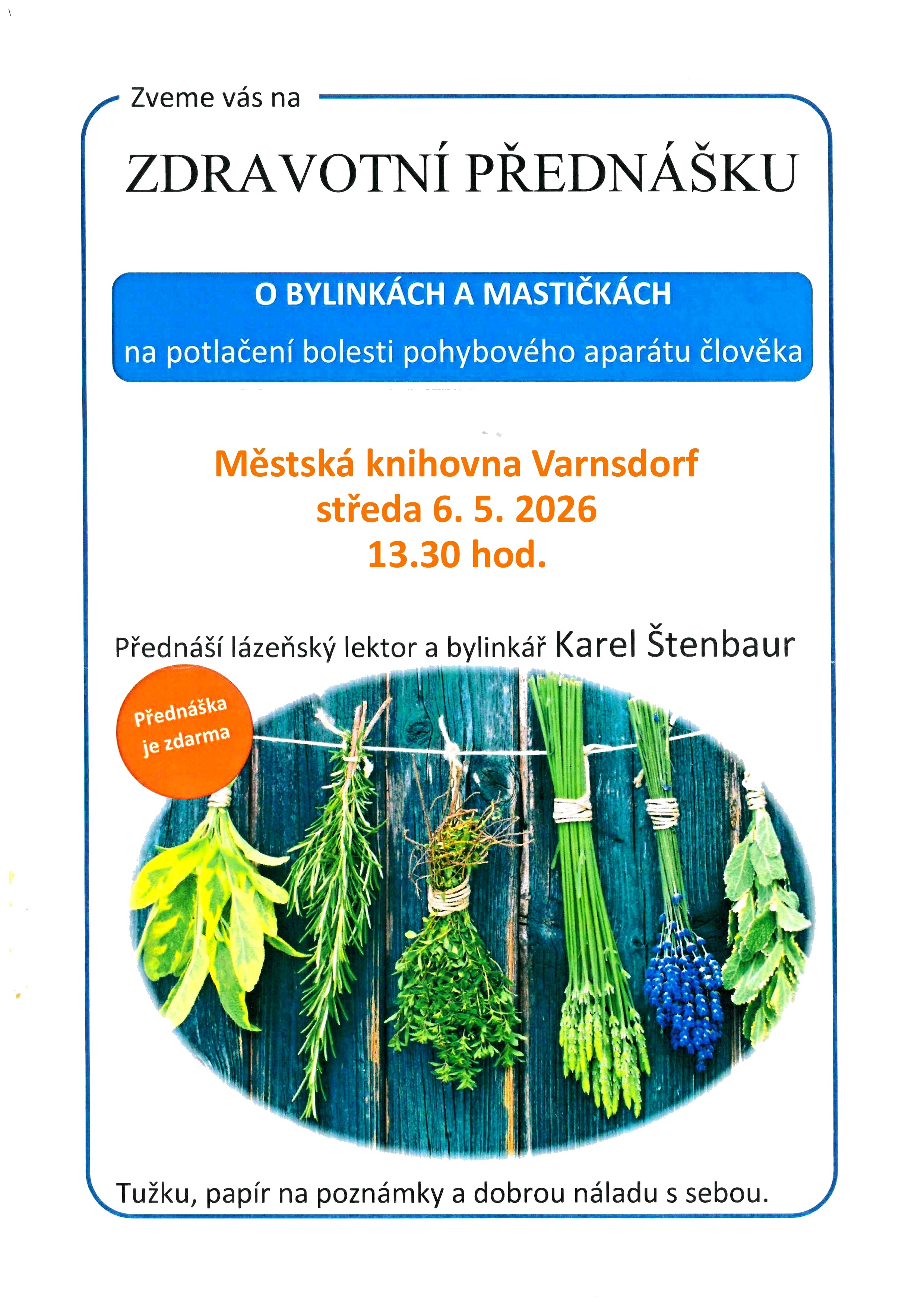Zveme vás do městské knihovny na zdravotní přednášku lázeňského lektora a bylinkáře Karla Štenbaura o využití bylinek a mastiček při potížích s pohybovým aparátem. Dozvíte se praktické rady pro potlačení bolesti přírodní cestou a vstup na celou akci je zdarma.