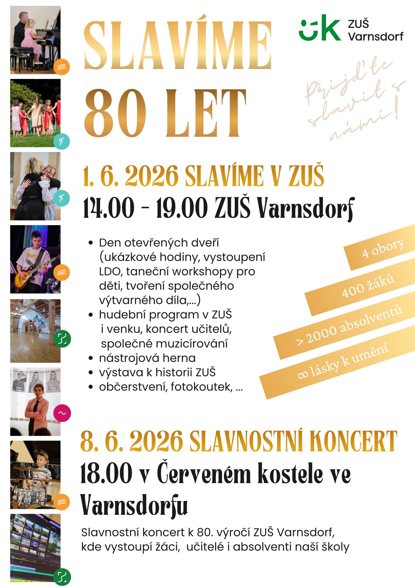 Základní umělecká škola Varnsdorf srdečně zve na oslavy 80. výročí svého založení, které nabídnou den otevřených dveří s bohatým programem, workshopy a výstavou z historie školy. Vyvrcholením oslav bude slavnostní koncert žáků, učitelů a absolventů v prostorách Červeného kostela.