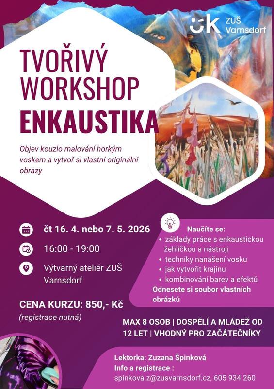 Základní umělecká škola Varnsdorf zve na kreativní workshop enkaustiky, kde se pod vedením zkušené lektorky naučíte tvořit originální obrazy pomocí malování horkým voskem. Kurz je vhodný pro začátečníky, mládež od 12 let i dospělé, kteří si chtějí vyzkoušet tuto fascinující výtvarnou techniku.
